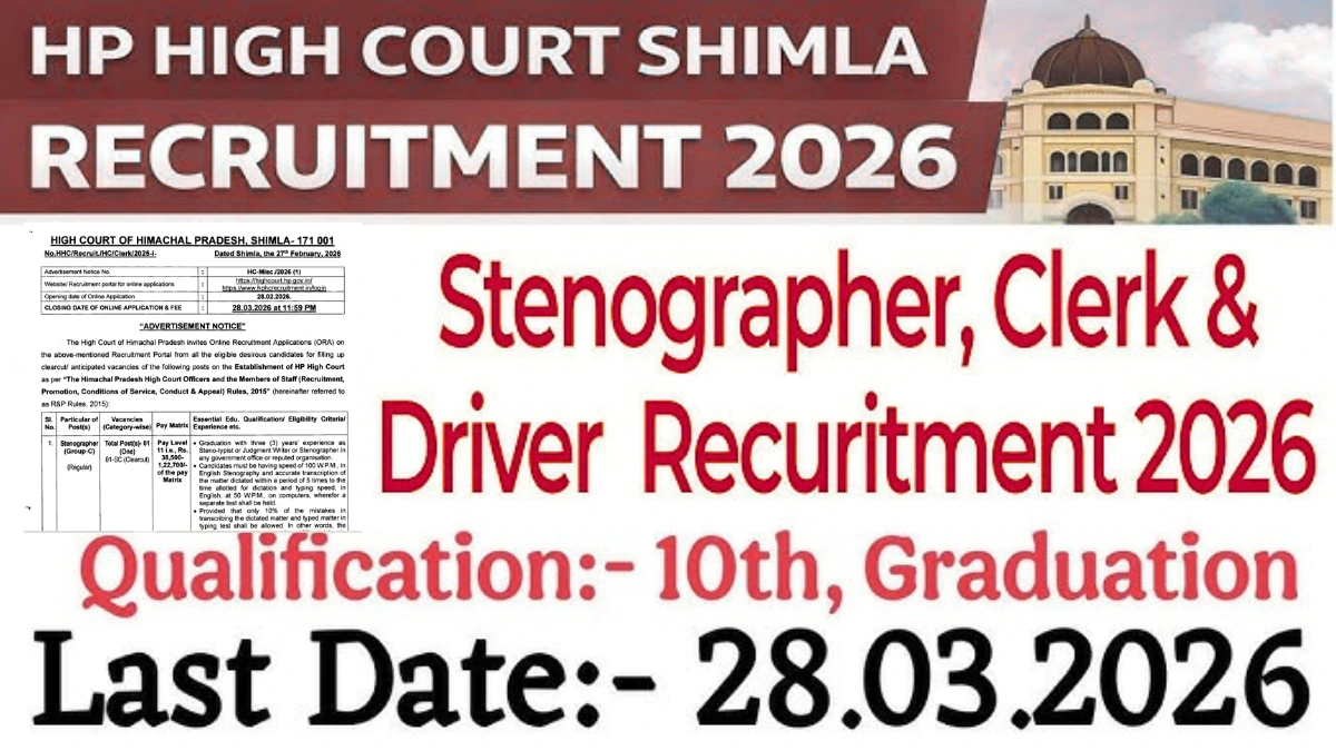 अगर आप सरकारी नौकरी की तैयारी कर रहे हैं तो आपके लिए अच्छी खबर है। हिमाचल प्रदेश हाई कोर्ट (HP High Court) ने वर्ष 2026 के लिए विभिन्न पदों पर भर्ती का नोटिफिकेशन जारी किया है। इस भर्ती के माध्यम से कई पदों को भरा जाएगा, जिनके लिए योग्य उम्मीदवार आवेदन कर सकते हैं।