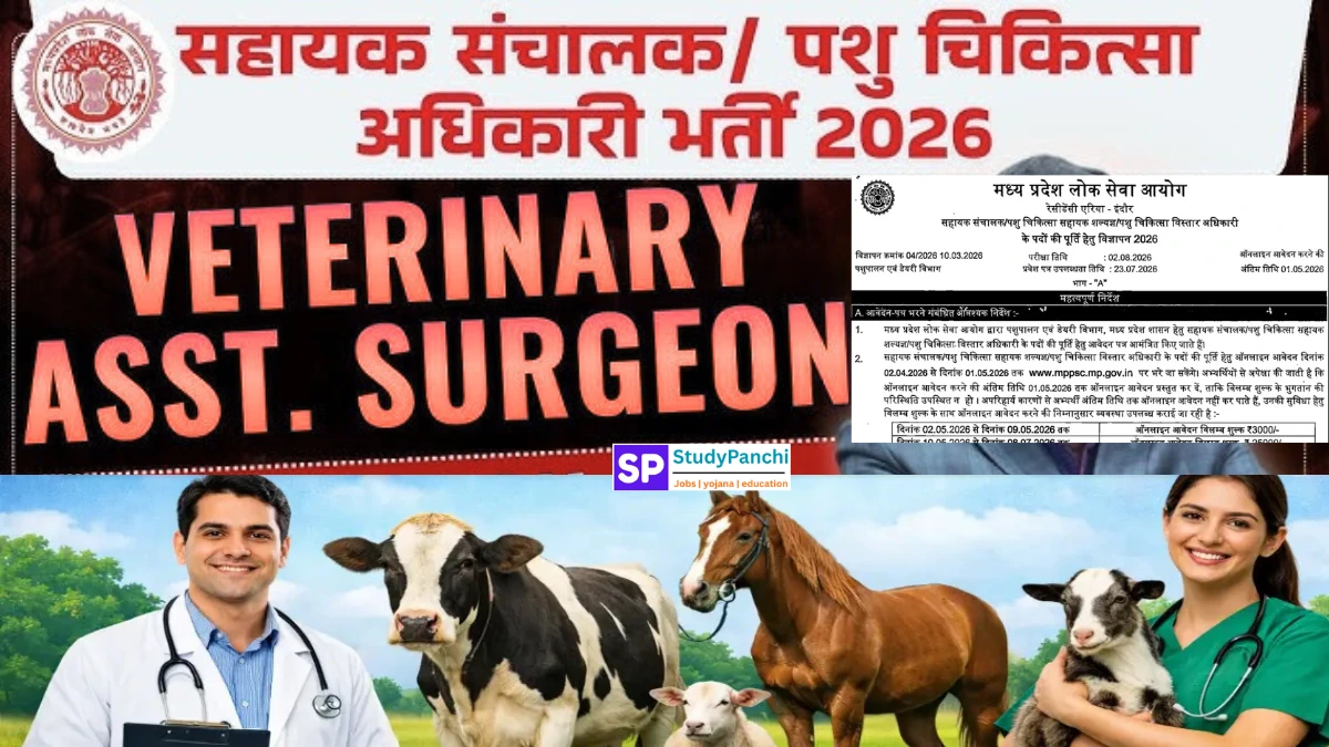 मध्य प्रदेश लोक सेवा आयोग (MPPSC) ने पशु चिकित्सा सहायक शल्य चिकित्सक (Veterinary Assistant Surgeon) के 80 पदों पर भर्ती के लिए अधिसूचना जारी कर दी है। यह उन योग्य उम्मीदवारों के लिए एक शानदार अवसर है, जिन्होंने पशु चिकित्सा विज्ञान में स्नातक की डिग्री प्राप्त की है और सरकारी क्षेत्र में स्थिर करियर बनाना चाहते हैं। आवेदन प्रक्रिया 2 अप्रैल 2026 से शुरू होकर 1 मई 2026 तक चलेगी। इस लेख में हम आपको इस भर्ती से जुड़ी सभी महत्वपूर्ण जानकारियाँ जैसे पात्रता, आवेदन शुल्क, चयन प्रक्रिया, परीक्षा पैटर्न, वेतनमान और अन्य आवश्यक विवरण विस्तार से प्रदान कर रहे हैं।