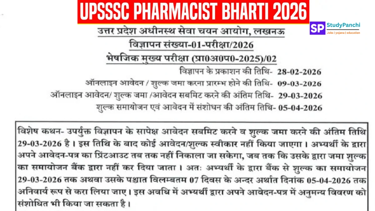 उत्तर प्रदेश अधीनस्थ सेवा चयन आयोग (UPSSSC) ने वर्ष 2026 के लिए फार्मासिस्ट पदों पर भर्ती की अधिसूचना जारी की है। यह भर्ती उन उम्मीदवारों के लिए महत्वपूर्ण अवसर है जिन्होंने फार्मेसी क्षेत्र में शिक्षा प्राप्त की है और सरकारी स्वास्थ्य विभाग में स्थायी नौकरी प्राप्त करना चाहते हैं। आयोग ने विभिन्न श्रेणियों में फार्मासिस्ट पदों के लिए ऑनलाइन आवेदन आमंत्रित किए हैं।